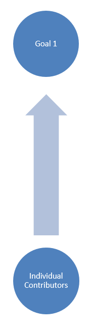 So let’s jump back to the Ugly Flower Principle. Figure 1 looks like a (relatively) pretty flower. The center hub is “everyone”–in the example above, Mary and me. However, Mary is working toward Goal 1, and I am working toward Goal 2. It creates a “pretty” idea–the organization might set these goals optimistically, hoping that Mary will make sure volume is covered and I will make sure tickets are sold at a good price–but the idea can break down in execution. Even in a best case scenario, Mary takes her little blue arrow in one direction and I take my little blue arrow in a different one.