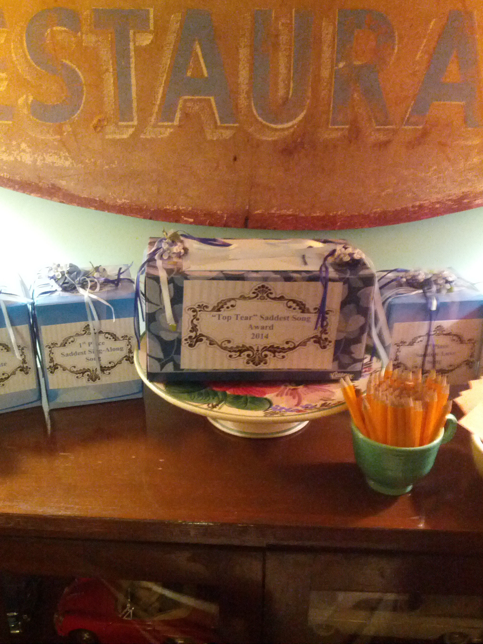 Over the course of the evening, I spent a good deal of time thinking about the value and space for sadness at a party. Of course, we were all there to entertain (and there were tissue-box prizes for standout performances in a variety of categories). Some of the songs featured a solo singer and instrumentalist, like Dan’s rendition of “When I Stop Dreaming.” Some featured a full 4+ person band. Some didn’t sound sad; perhaps they had a bluegrass or jazz vibe that created a more upbeat feel even as the lyrics told a sadder story. Certainly when I stood up there, my goal was to create a stark, sad sound.